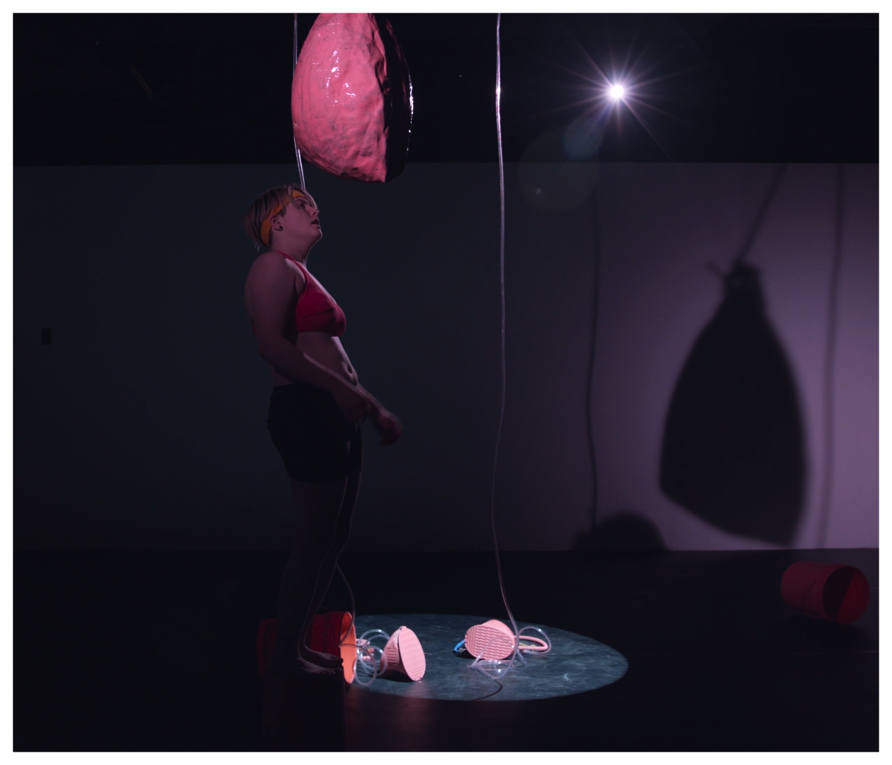 Over time I have begun to structure my practice through different verbs I seem to gravitate towards while designing performances. Inflation, or the cycle of air between myself and another object is a subject that I have revisited countless times in my durational work. Through multiple performances exploring this verb I discovered that what became interesting to me was not the end product of the “inflated object” but instead the state of inflating. The capture of measured time, the exhausted body either giving air or having air taken from it. I began to create my own dialogue around a half inflated object, finding that it lives in an in-between space, or “uncanny reality”. Through this realization I have begun to create performances that showcase this middle state. I want the viewer to be aware of air being held in, the struggle of material and the release of my own breath. The time it takes to reach its end point in either direction before starting all over again. For me inflation is this “breathing” or record of time. Goliath would be the culmination of four performance experiments that have lead me to these definitions.